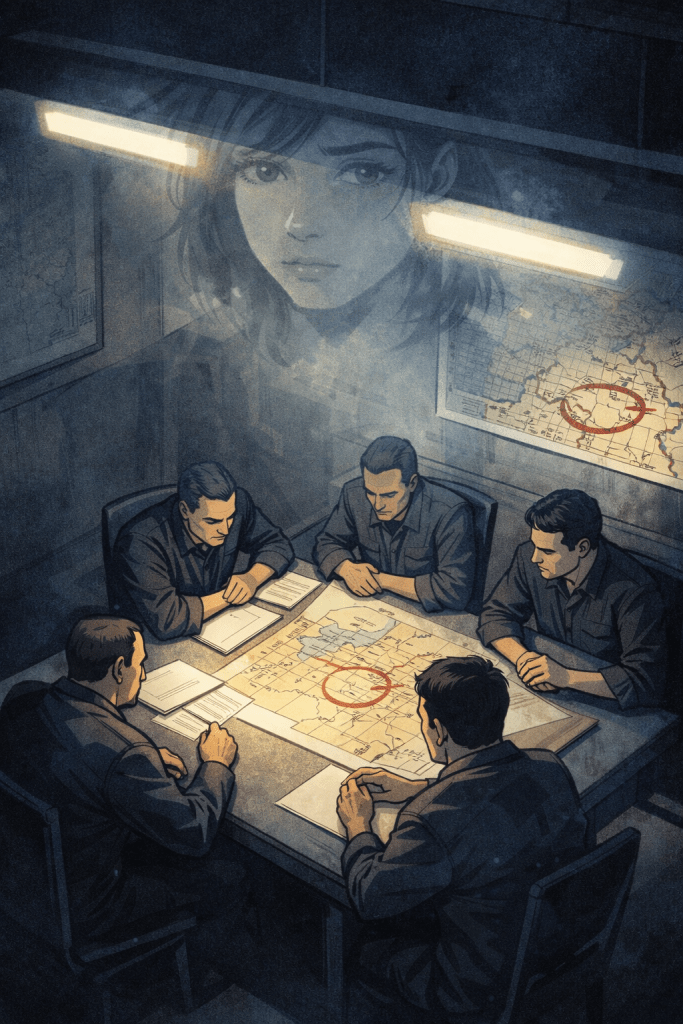 Fluorescent lights hummed over a long metal table. Four men in plain clothes sat around it, a fifth stood near a whiteboard covered in maps and photographs. Outside, beyond a barred window, the faint, gritty daylight of some unfamiliar city pressed against dusty glass.